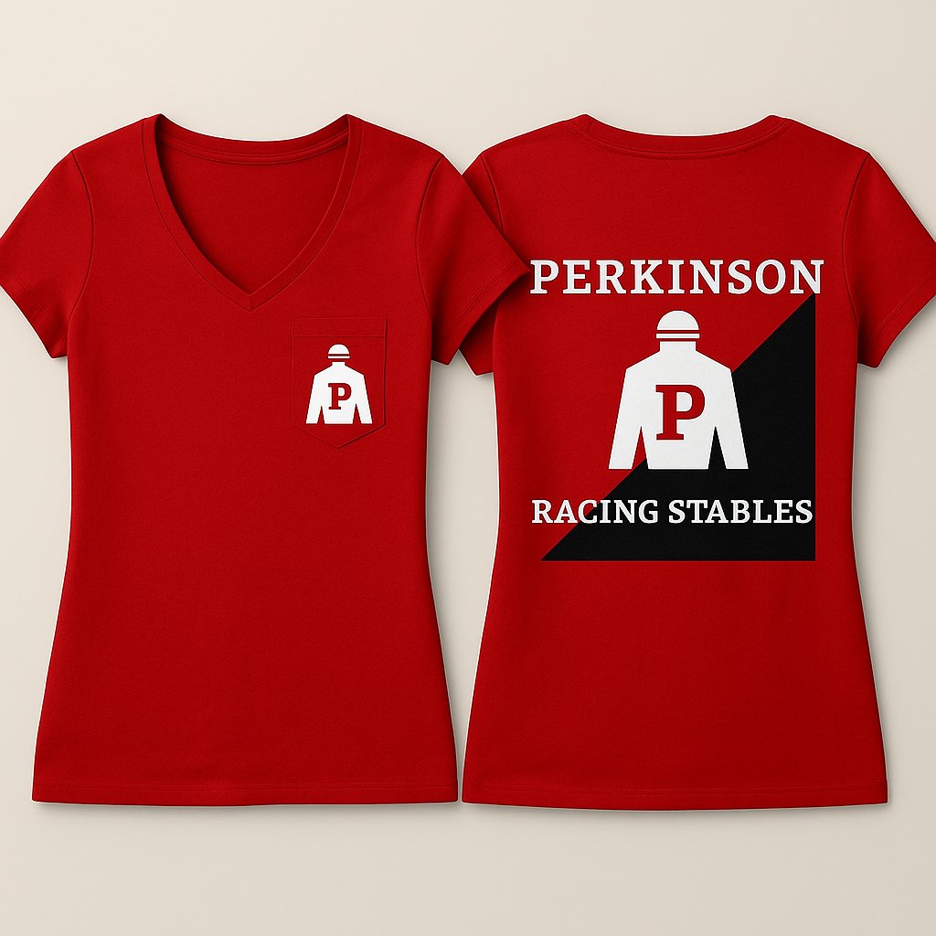Turn heads at the track or on the street in this bold red V-neck tee, designed just for women who live life full throttle. Featuring the iconic Perkinson Racing Stables silks on the front left chest and the full team logo screen-printed on the back, this shirt strikes the perfect balance of sporty and stylish.