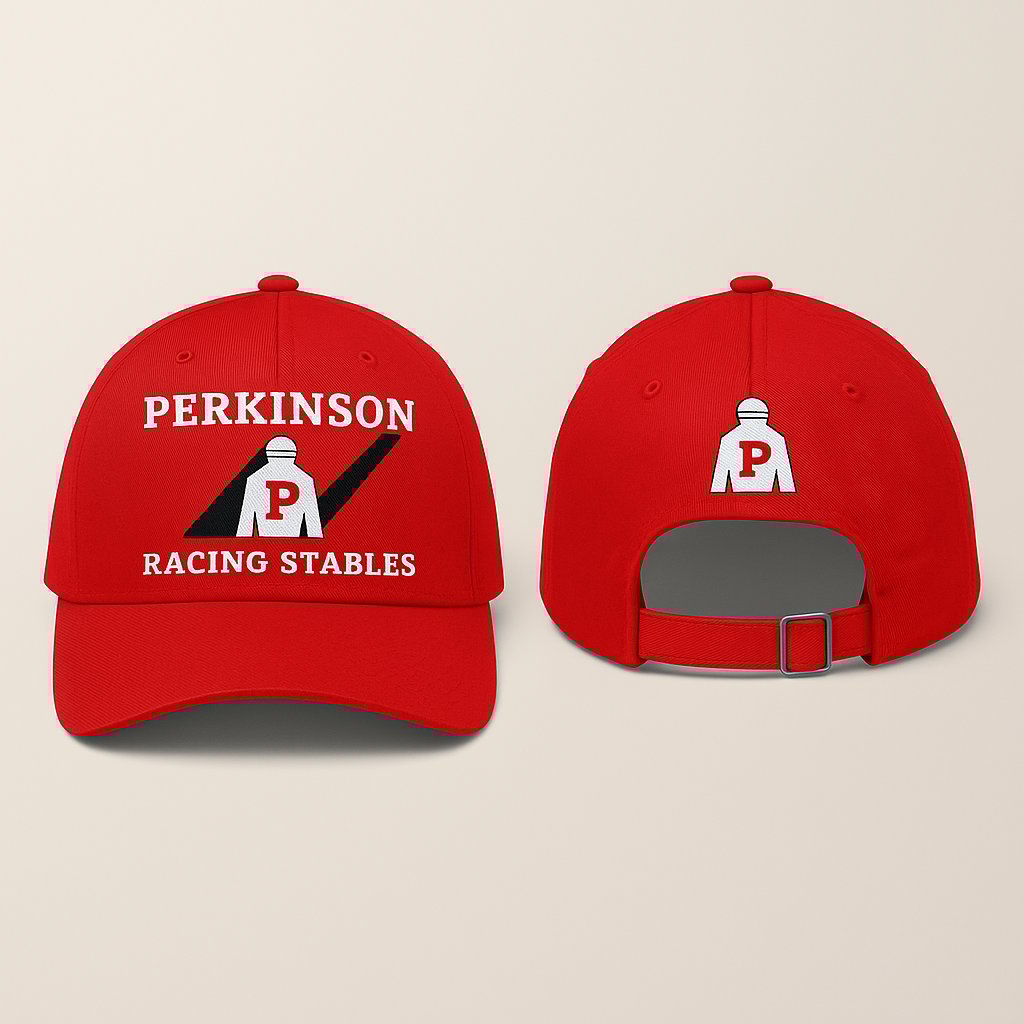 This bold red hat is built for the track and the town. Featuring the Perkinson Racing Stables logo embroidered on the front and our iconic silks on the back, it’s a full-circle win for fans and fierce competitors alike. The curved brim keeps the sun out while you handle business—and the adjustable strap ensures a perfect fit every time.